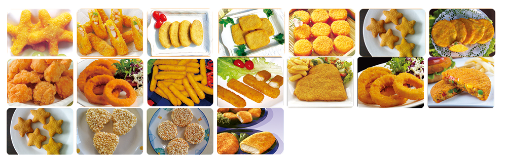 Breading machine is used to evenly coat the breadcrumbs in chicken, beef, pork, fish, shrimp and other seafood products through the crumbs discharged from the hopper and the crumbs in the bed.