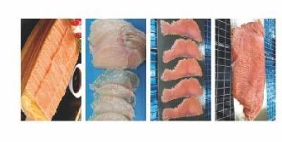 Cooked salmon machine fresh slicer is avaiable for fish and meat to slice into fixed thickness with multi angle. suitable for salmon, chicken breast, red meat, bacon and other fresh or cooked meat.