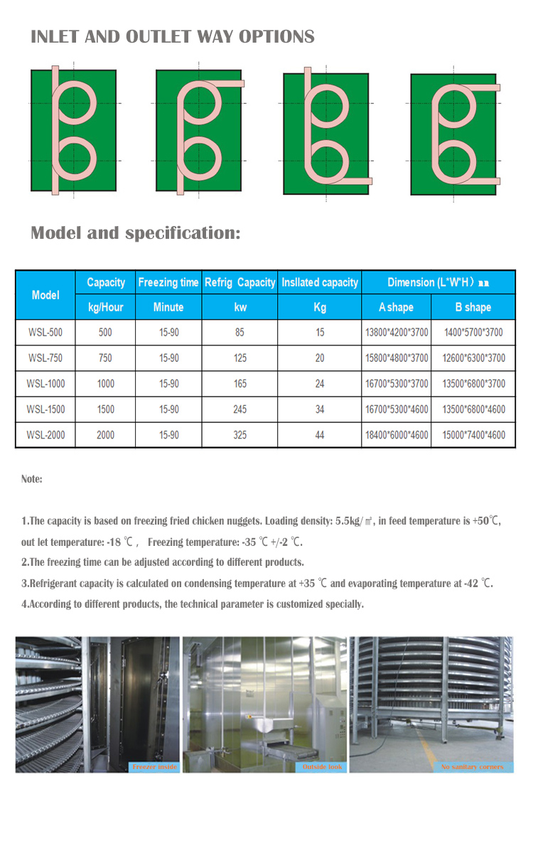 The inlet and outlet of the single-spiral quick-freezer can be divided into two forms: upper in and lower out or lower in and upper out, while the double-spiral freezers’ inlet and outlet are at the bottom, and the selection of inlet and outlet directions is also more flexible and easier to match. Combination of other supporting equipment to realize modern assembly line production.